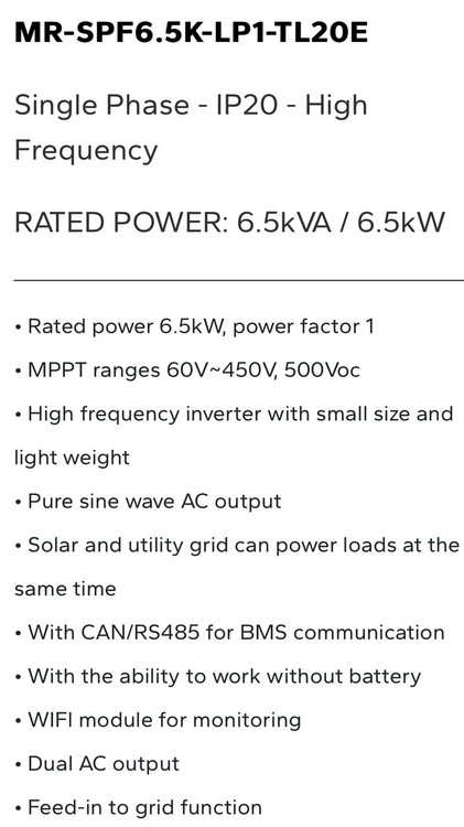 | Output Power | Nominal 6kW; 6.5kW @PV+Battery | ||||||