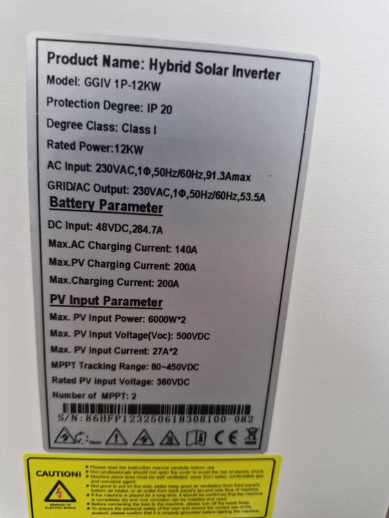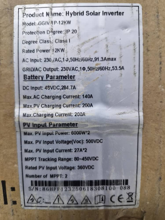 Model GGIV 1P-12KW PV (DC Input) Recommended Max. PV Input Power 12000W Max. Input Voltage (Voc) 500V MPPT Operating Voltage Range 85V-450V (@75V Start Up) Number of MPPT 2 Max. Number of Input Strings per MPPT 1 Max. Input Current per MPPT 27/27A Max. Short-circuit current per MPPT 35/35A Grid (AC Input) Max. Input Power 16000W Max. Input Current 90A Rated Grid Voltage 220/230/240Vac Rated Grid Frequency 50/60Hz Acceptable range 170-280Vac (For UPS); 90-280Vac (For Home Appliances) Battery Parameters (Bidirection) Battery Type LiFePO4 / Lead Acid Battery Voltage Range 40~60Vdc Rate Battery Voltage 48Vdc Max. Charge/Discharge Current 210A/230A BMS Communication Mode RS485 Back-up Output (AC Output) Rated Output Power 12000W/12000VA (Twin Output) Rate Output Current 54.5A Rated Output Voltage/Frequency 220/230/240Vac 50/60Hz Parallel Capacity Max. 12 Units Surge Power 24000VA 5s THDv\ (@ linear load) < 3 % Switching Time 10ms Typical (For UPS); 20ms (For Home Appliances) Efficiency Peak Efficiency 98.00% Max. MPPT Efficiency 99.90% Protection Inner Protection ✓Output Short-Circuit Protection ✓Output Over-Voltage Protection Surge Protection PV: Type III, AC: Type III IP Rating IP54 General Parameters Operating Temperature Range-100C~550C Relative Humidity Range 5%~950C Max. Operating Altitude > 2000m Derating Standby Self-Consumption < 20W Installation Type Wall Mounted Cooling Mode Fan Cooling Communication RS232 / RS485 / Dry Contact / WI-FI Display LCD Mechanical Specifications Inverter Dimensions (L*W*H) (mm) 630*535*125 Net Weight (kg) 27 Shipping Dimensions (L*W*H) (mm) 745*650*240 Gross Weight (kg) 30